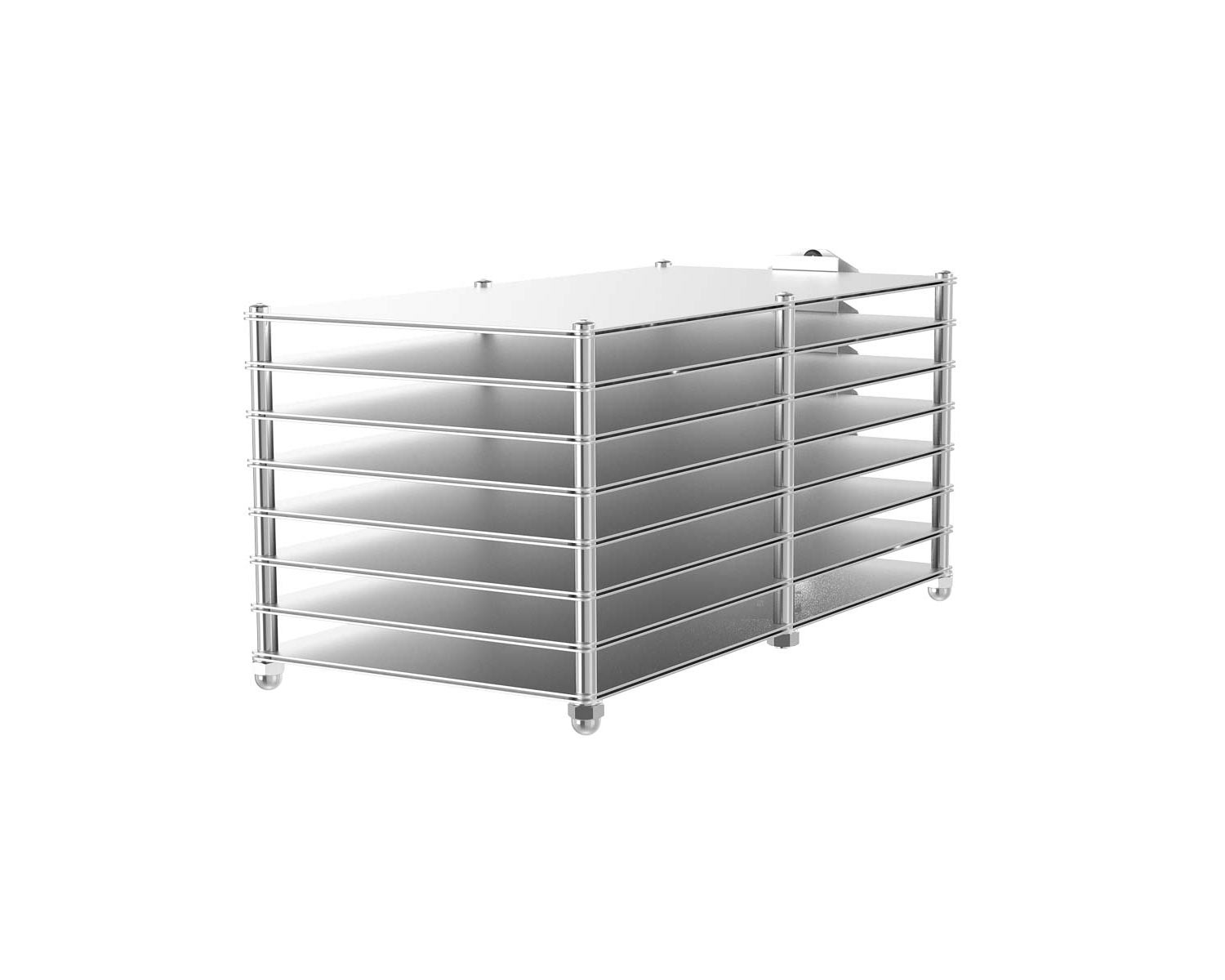 The CryoDry® CD8 Fixed 7 Heated Shelf Stack is designed for high capacity use with small product. This stack consists of seven fixed heated shelves with dimensions of 465 mm x 210 mm, providing a total shelf area of 6,832 cm². The inter-shelf distance of 22 mm allows for optimal air circulation during the freeze drying process.